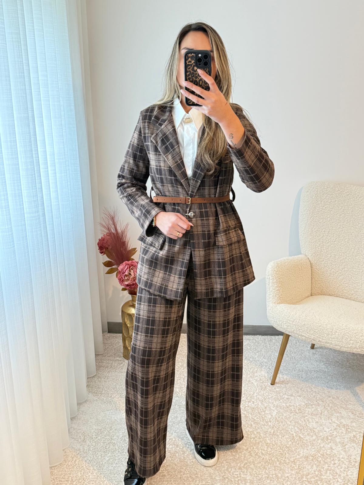Fato Xadrez. Blazer com cinto, calça com elástico na cintura.