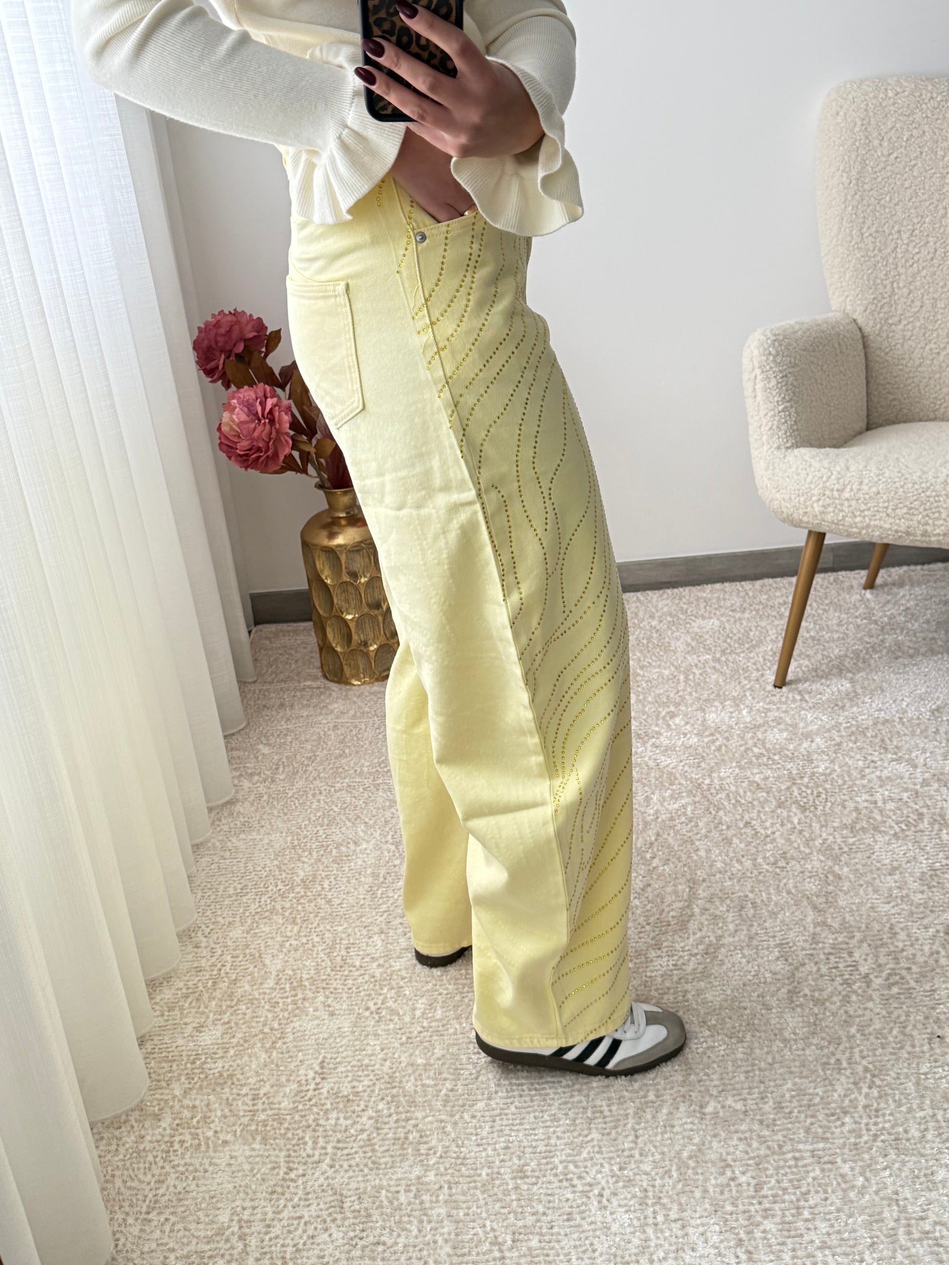 Jeans ballon em amarelo com brilhantes na frente.