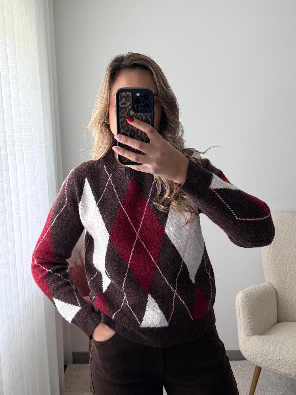 Malha losangos em tons de vermelho branco e castanho.