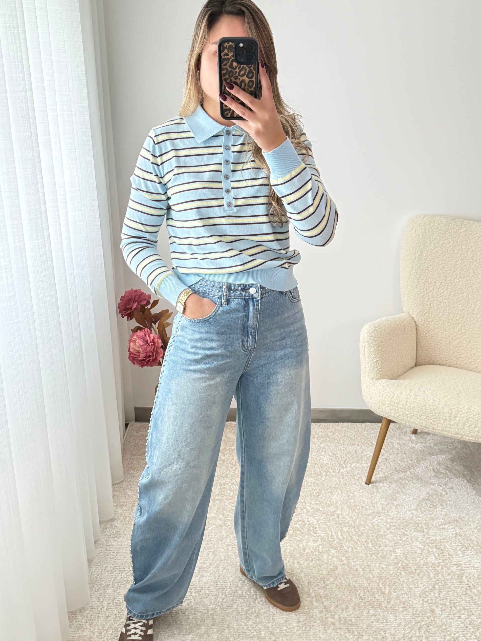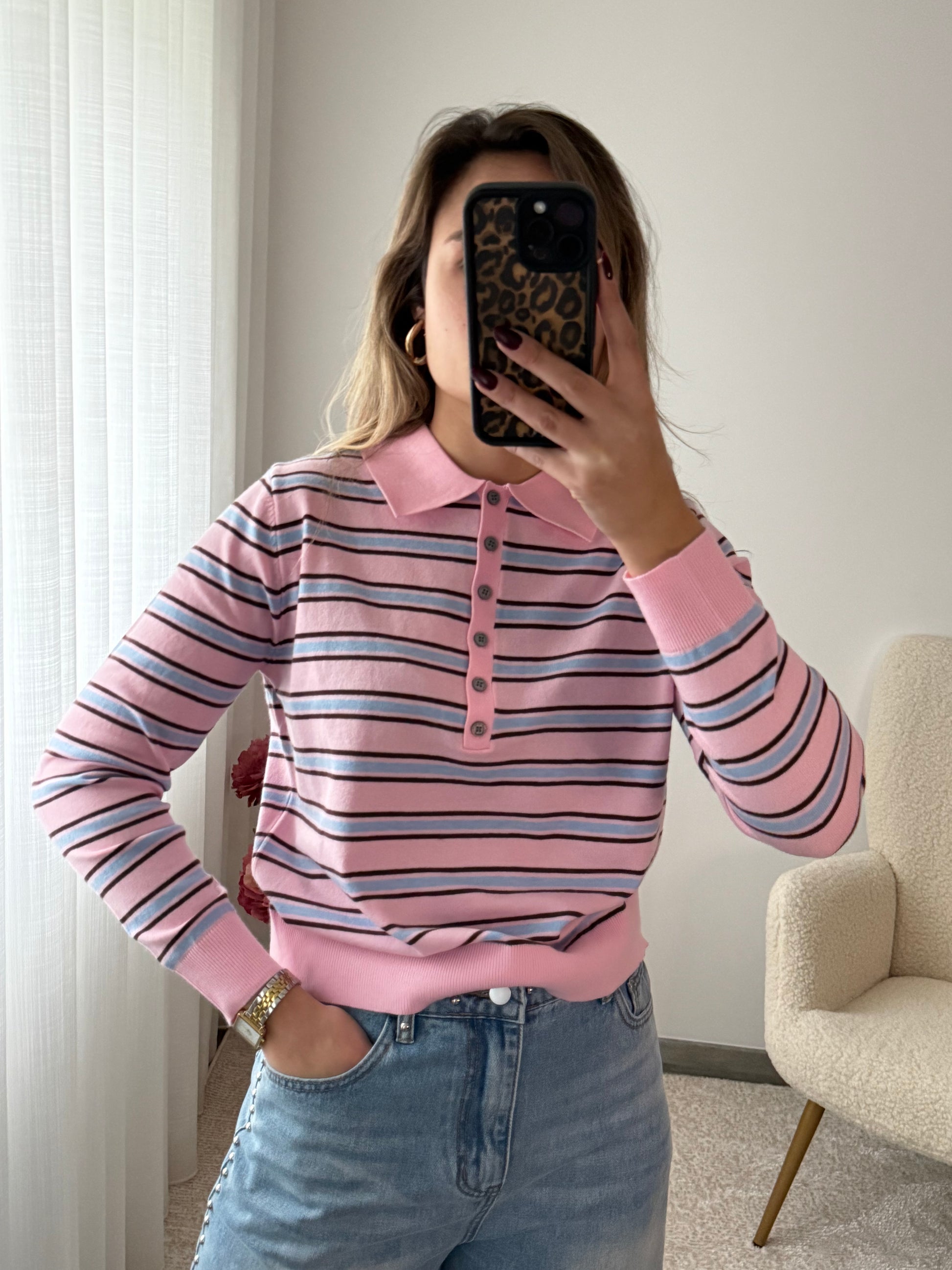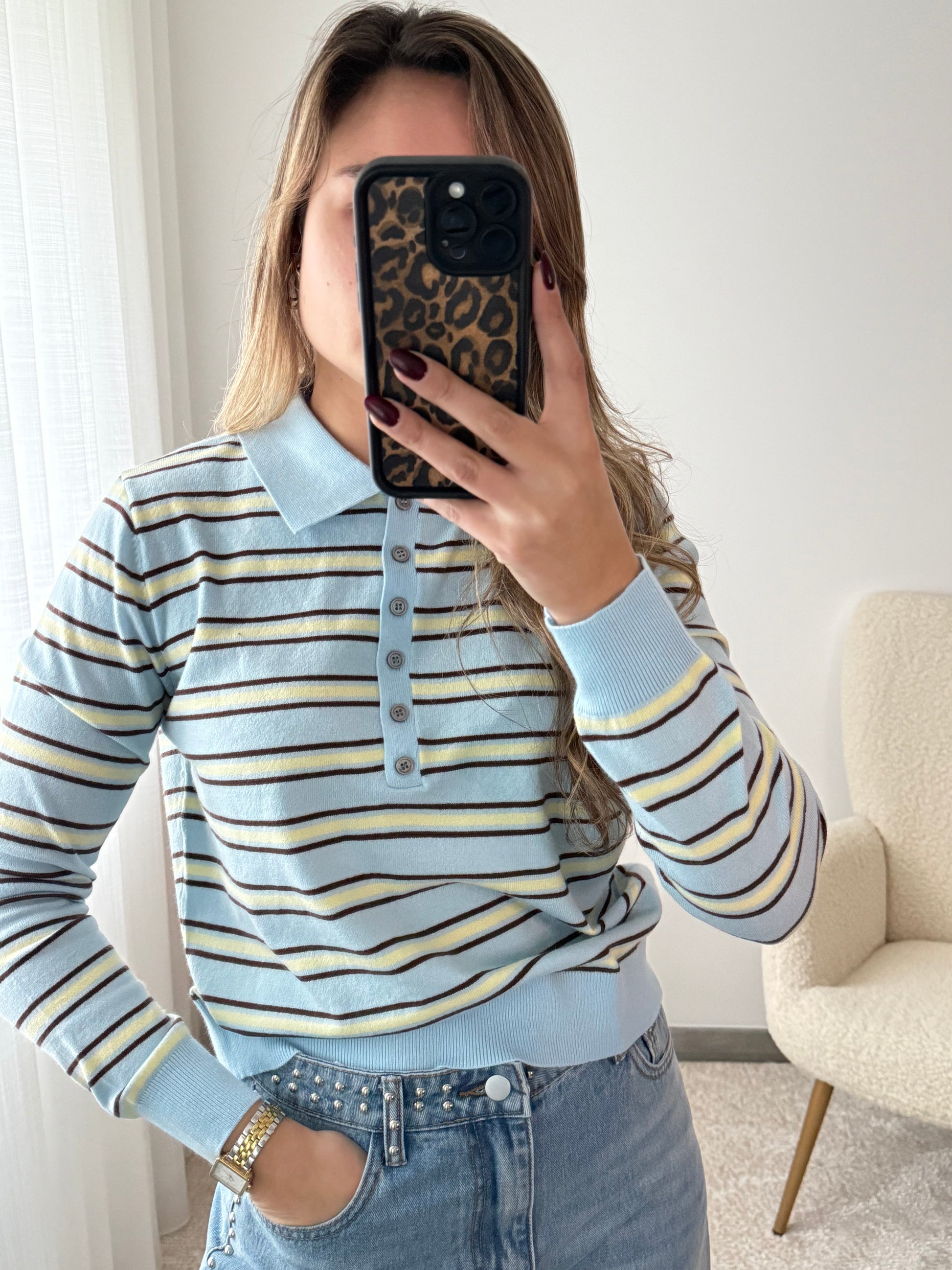 Polo com riscas em malha.