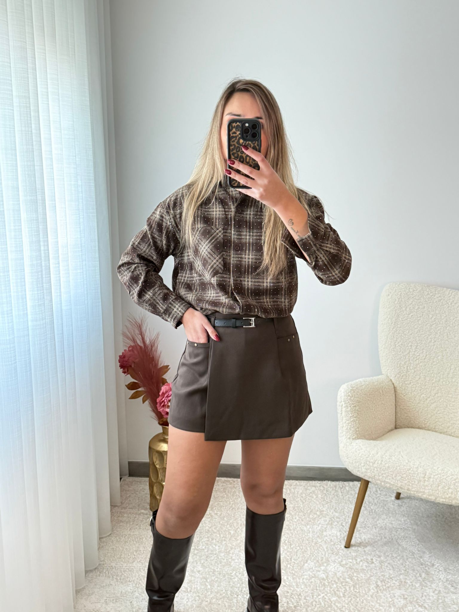 Saia-calção em castanho com cinto e duas aplicações em dourado na zona dos bolsos.