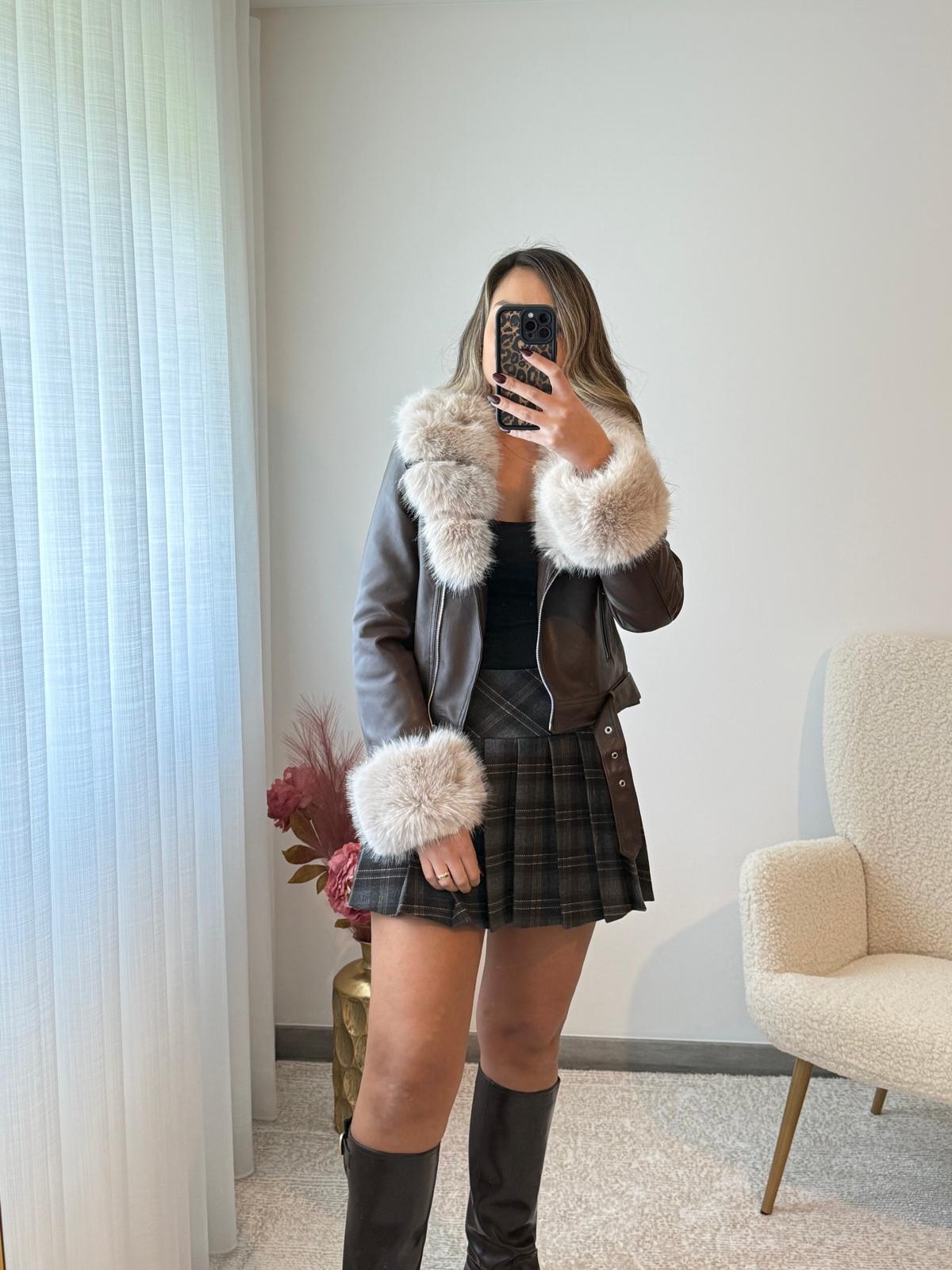 Saia com pregas aos quadrados em tons de castanho.