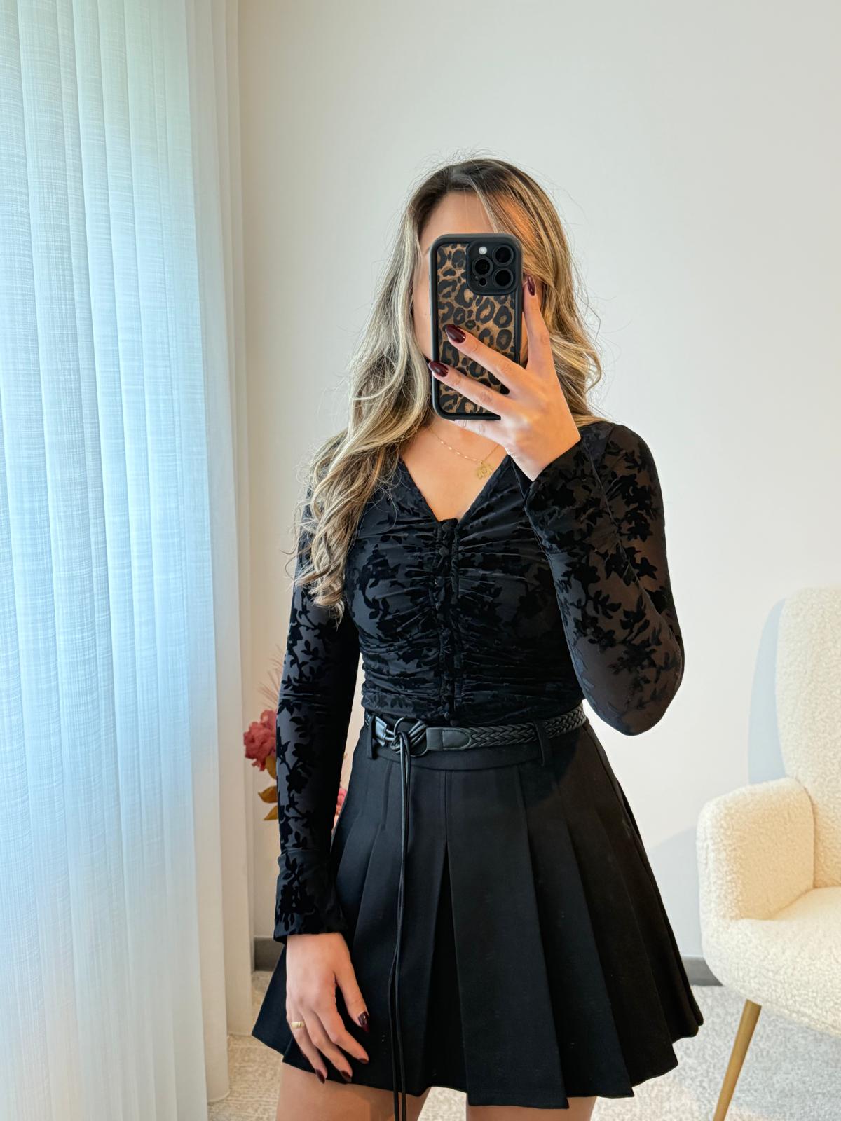 Saia em fazenda preta com pregas e cinto.